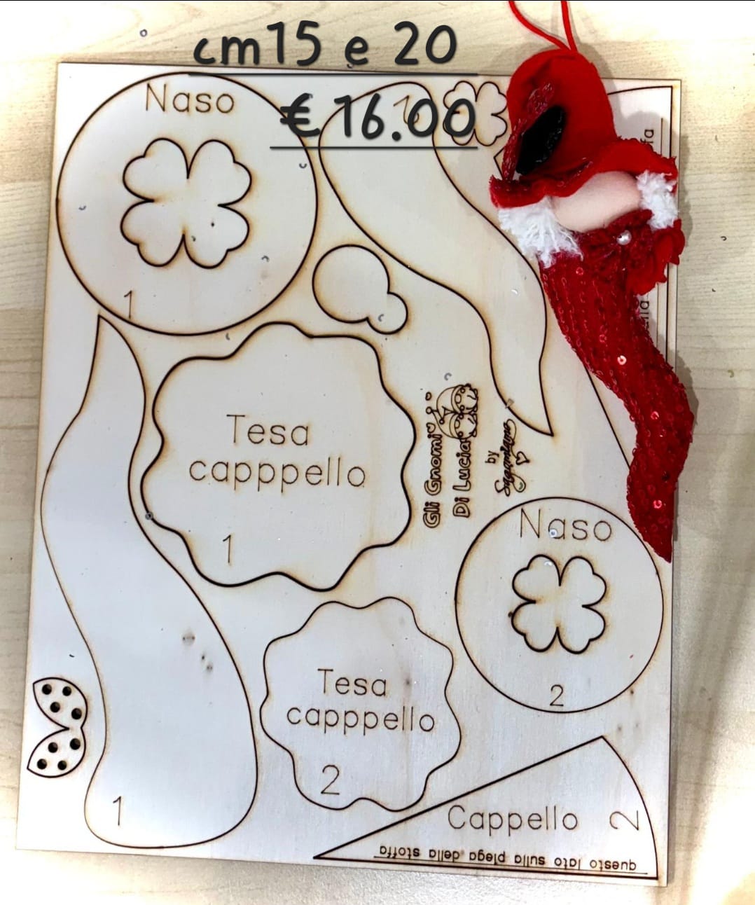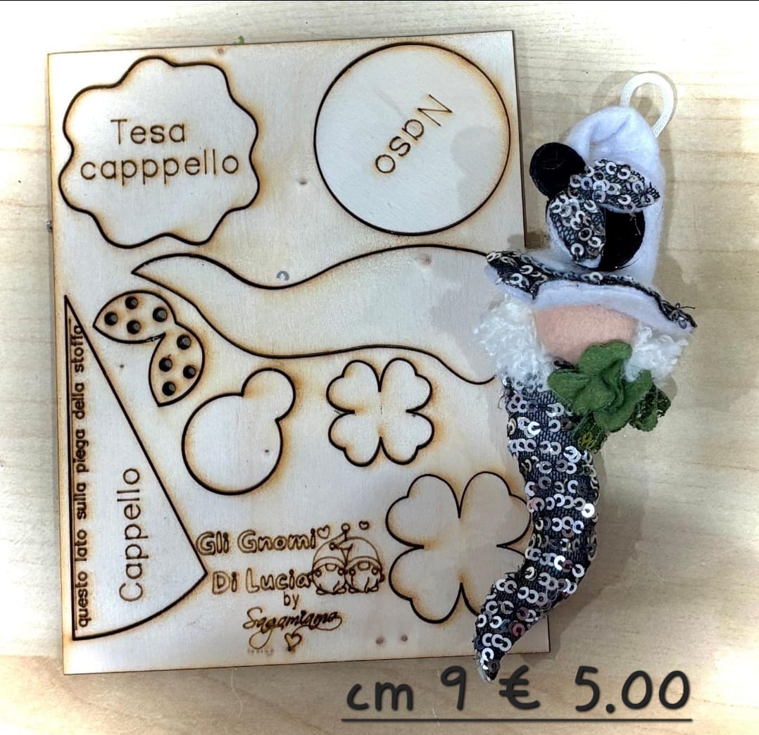 Le forme comprendono elementi come cappello, naso, dettagli decorativi e parti del corpo, perfetti per essere assemblati, rivestiti in stoffa, feltro o altri materiali creativi. Le incisioni laser garantiscono precisione, bordi puliti e facilità di utilizzo anche per chi è alle prime armi.