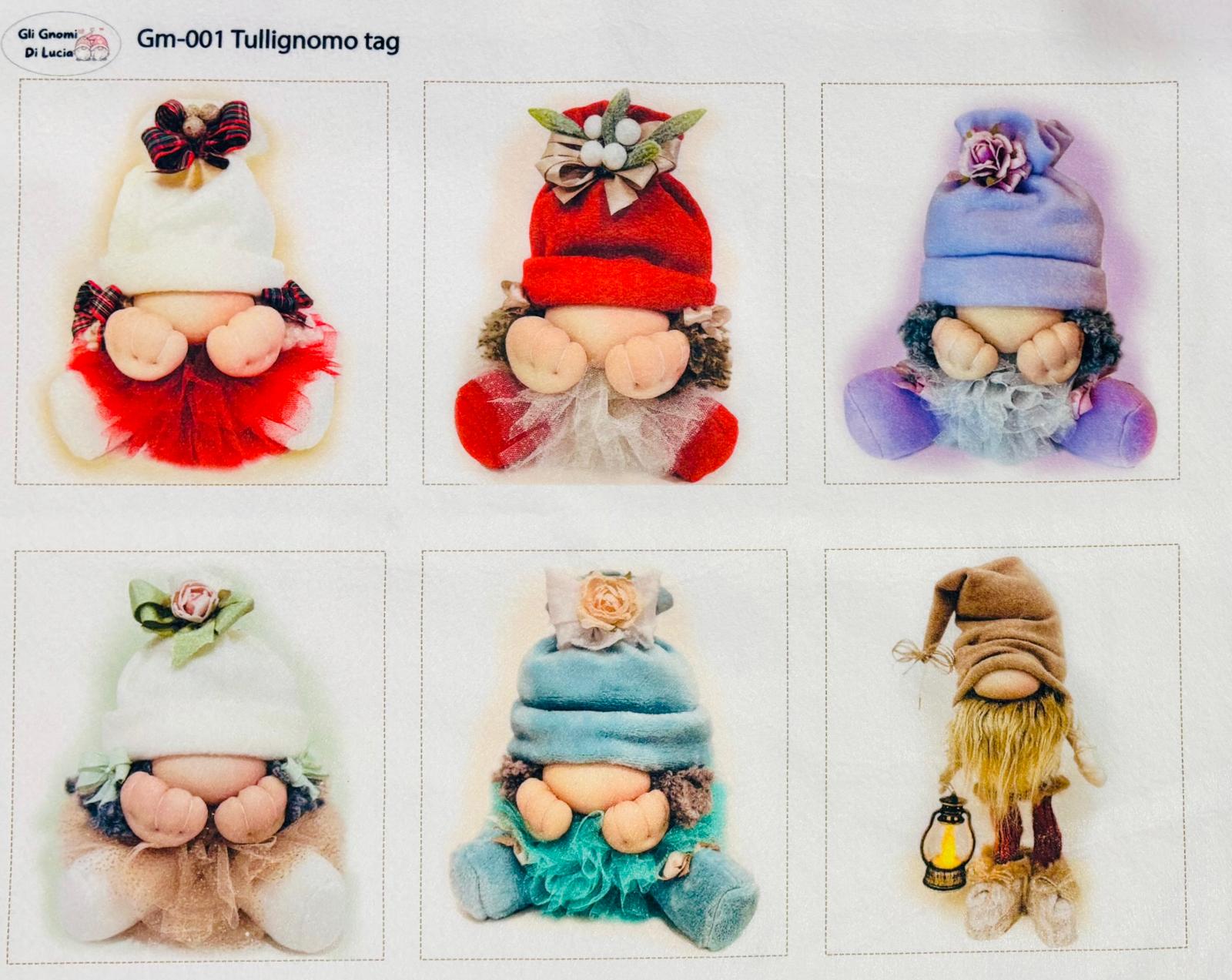 Un pannello stampato in morbido tessuto con 6 tag Tullignomo da ritagliare, ideali per decorazioni, fiocchi, chiudipacco, fuoriporta, ghirlande e progetti creativi.
