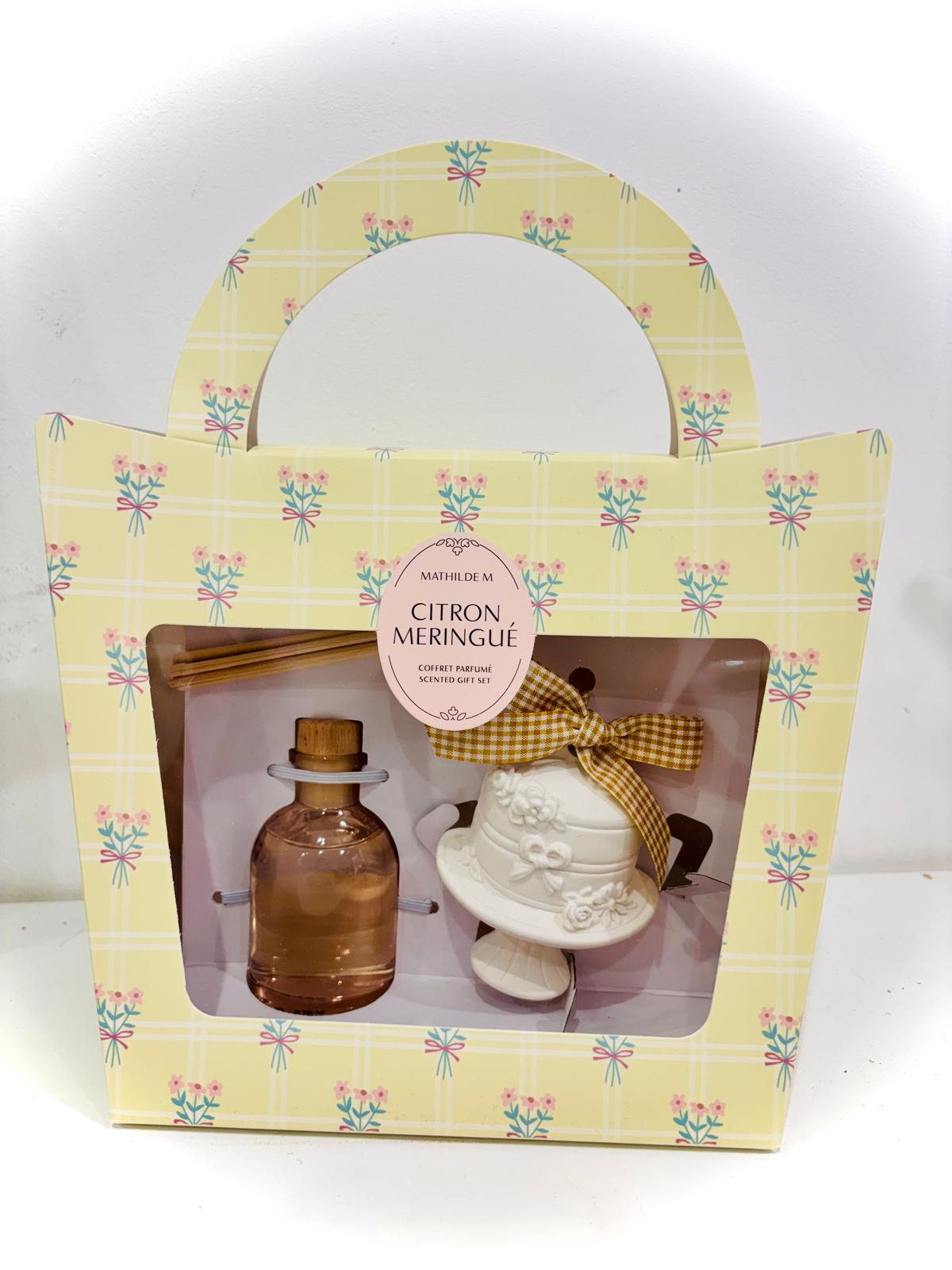 Il set include un diffusore per ambiente con bastoncini in legno e un raffinato diffusore in ceramica decorativa a forma di teiera, impreziosito da dettagli floreali e fiocco in tessuto coordinato. La fragranza Citron Meringué sprigiona una profumazione fresca e dolce, con note agrumate e golose che rendono l’atmosfera accogliente e luminosa.