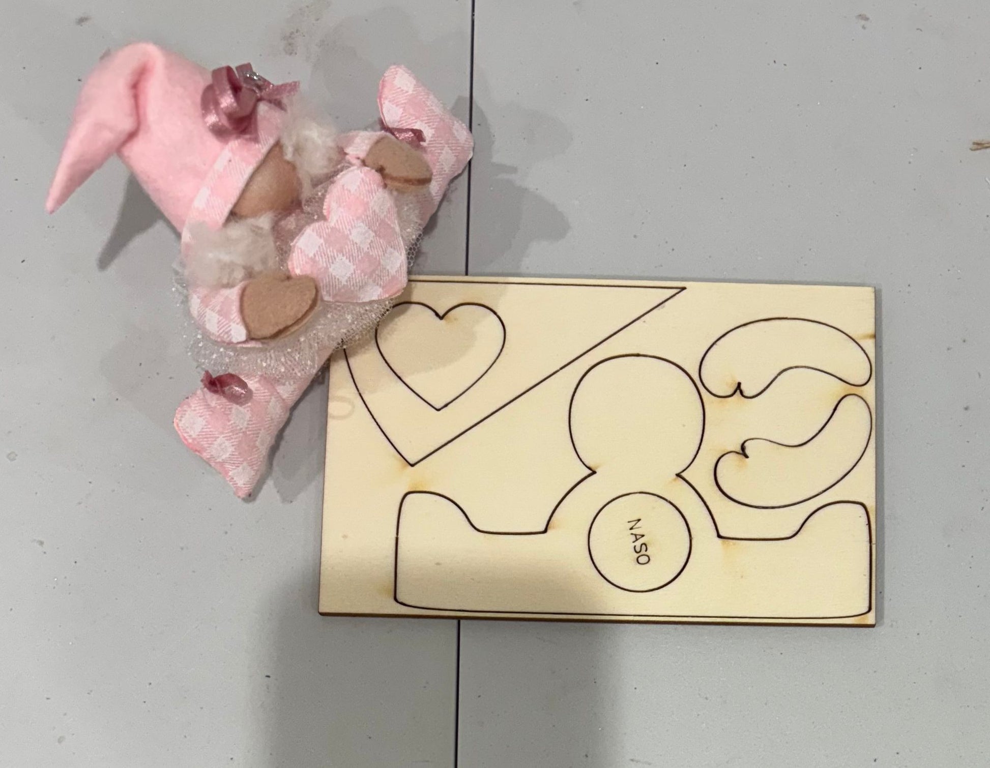Il Carillon è una sagoma in legno completa di tutti i pezzi da ritagliare e assemblare: base, cuore, fiocco e naso.