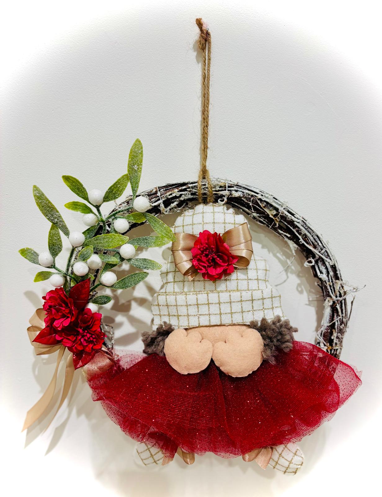Ogni creazione è realizzata a mano in Italia da Gli Gnomi di Lucia, con materiali di qualità e dettagli curati: la corona intrecciata, le bacche innevate e i fiocchi rossi rendono questo fuoriporta una decorazione natalizia artigianale unica, capace di donare calore e armonia a ogni ambiente.
