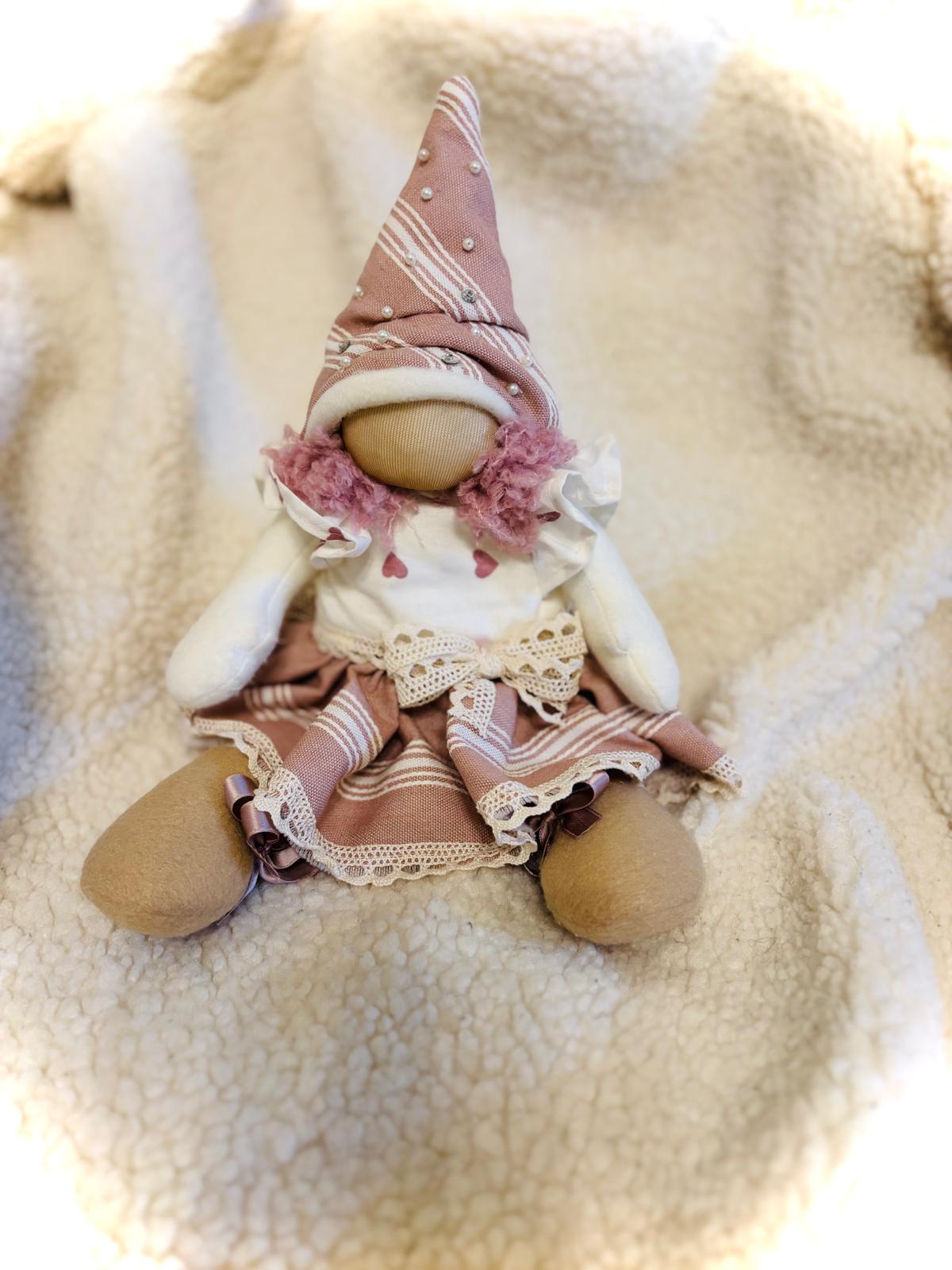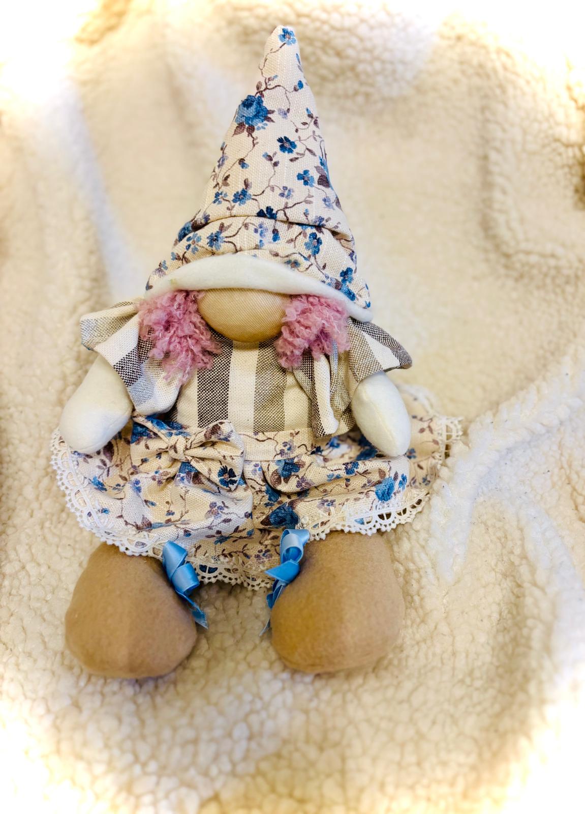 I tessuti floreali, i dettagli in pizzo e i piccoli fiocchi azzurri rendono questa gnoma delicata ma piena di personalità, perfetta come decorazione handmade o idea regalo originale.