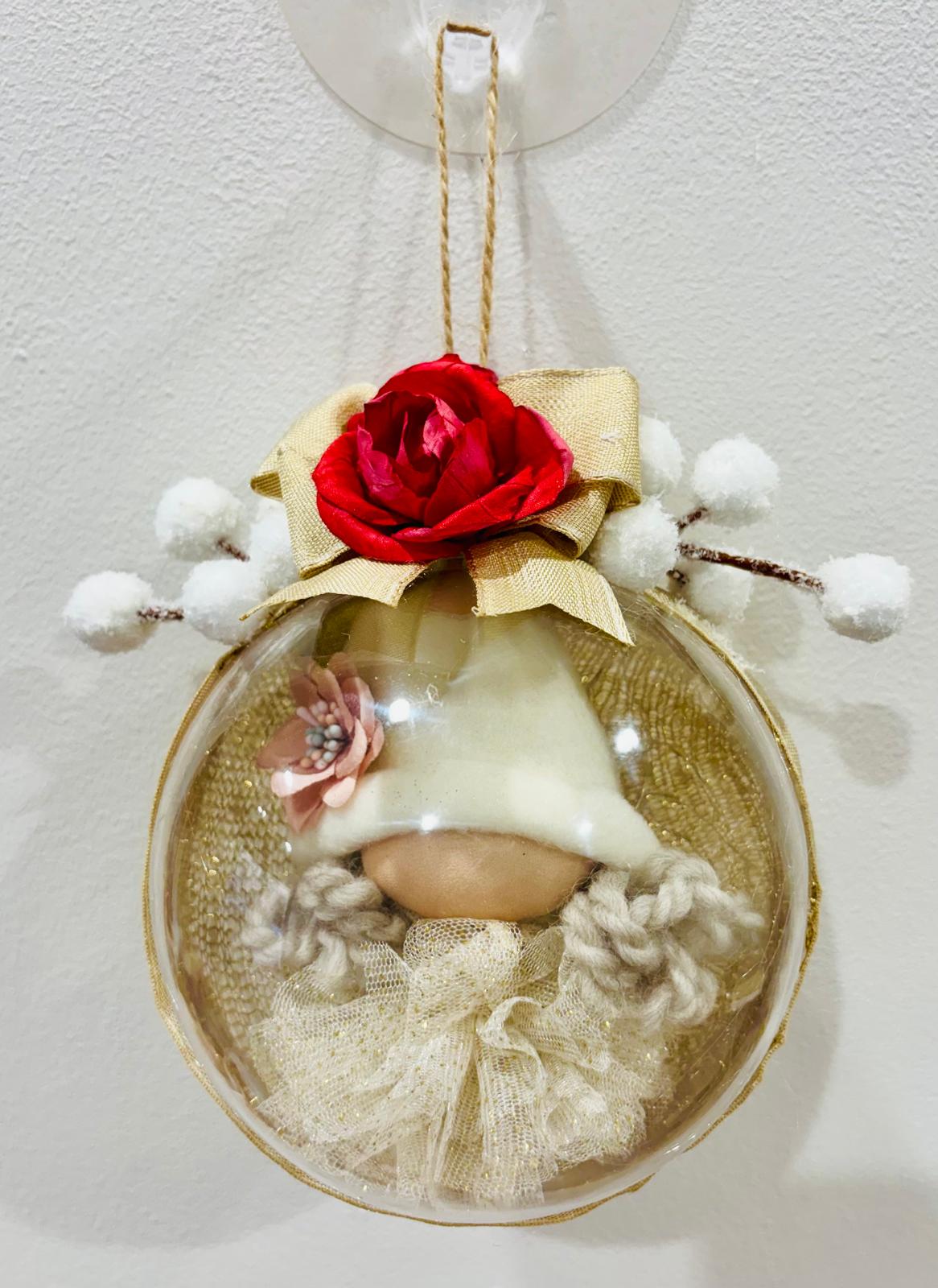 All’interno della sfera trasparente si nasconde una tenera gnomina fatta a mano, con cappellino panna, treccine di lana e un soffice abito in tulle dorato.